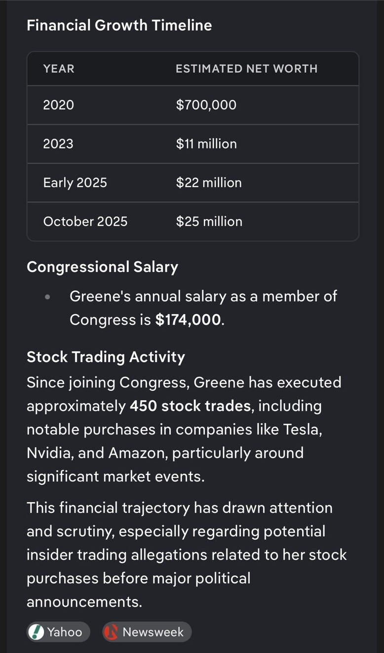 The truth comes for all. Greene’s numbers don’t lie, even if her explanations do. You don’t go from seven hundred thousand to more than twenty million in one congressional term unless the system is paying you back in ways the public was never meant to see. Perfectly timed trades. Assets that magically appreciate the moment you’re sworn in. A national fundraising machine that turns every controversy into cash.